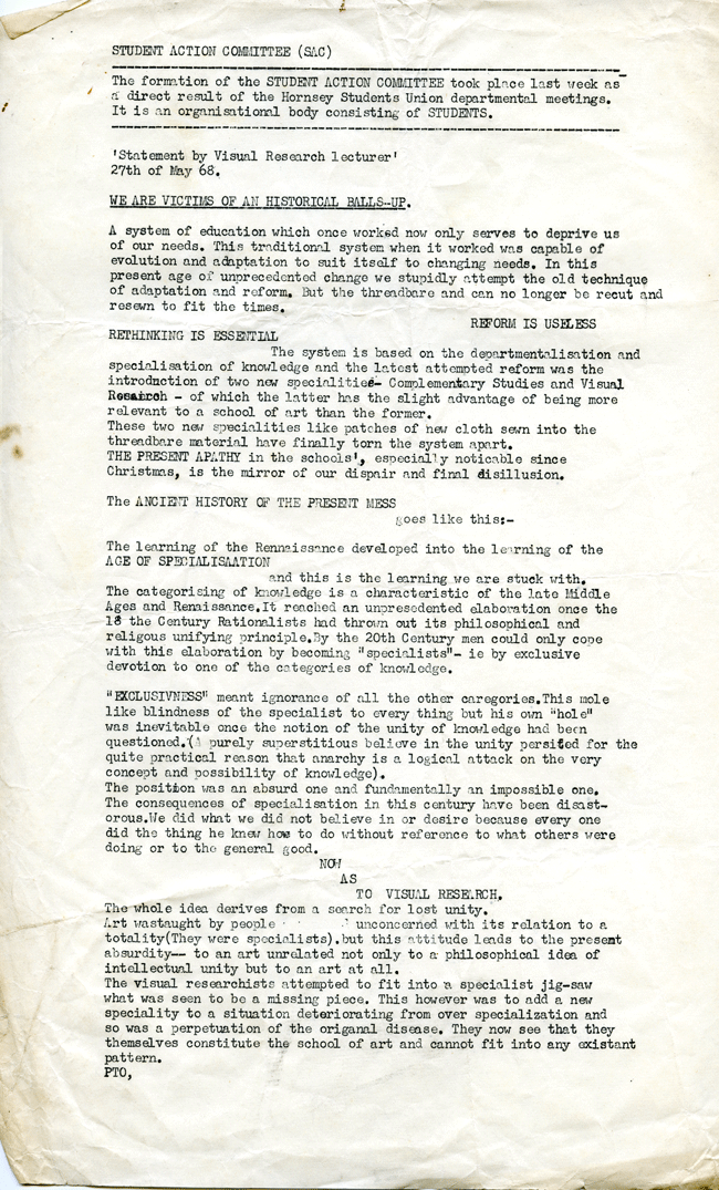 Hornsey College of Art Student Action Committee – Statement by Visual Research Lecturer, 1968